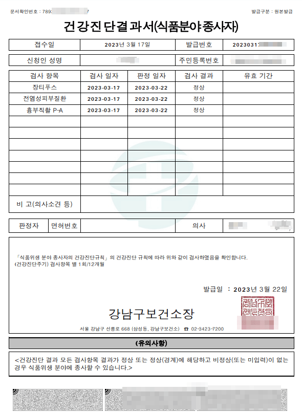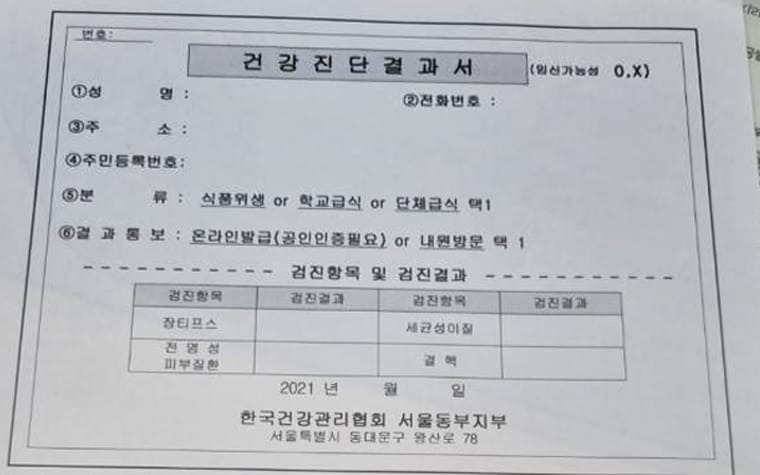 위생과 직접 관련이 있기 때문에 반드시 검사를 받은 후 발급받아야 하며, 검사 항목도 정해져 있습니다. 따라서 보건증 없이 근무할 경우 사업장과 본인 모두 불이익을 받을 수 있어요.